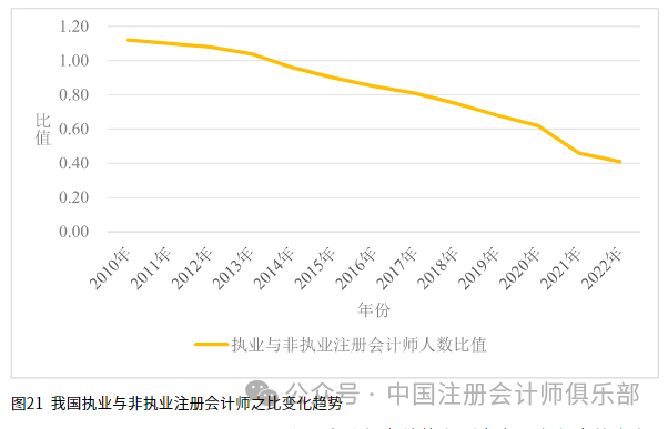截至2022年12月31日,我国共有执业注册会计师98,099人,非执业注册会计师237,494人,执业与非执业比值为0.41。2010~2022年各年度执业与非执业人数和比值具体如图4所示。历年来,执业与非执业注册会计师人数之比值不断下降,从2010年的1.12下降至2022年的0.41;2014年开始,非执业注册会计师人数超过执业人数,且二者的差距也在逐年加大。
