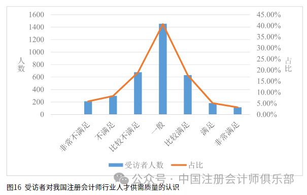 2.我国注册会计师行业人才的供需质量。受访者对我国注册会计师人才质量满足社会经济发展需要的程度进行评分,受访者打分越高代表我国现阶段注册会计师人才质量满足社会经济发展需要的程度越高,具体结果详见图16。可见,40.74%的受访者认为我国注册会计师行业人才质量的供需匹配程度处于一般水平,33.23%的受访者认为我国注册会计师行业人才质量的供需匹配程度处于偏不满足状态(包括比较不满足、不满足和非常不满足),26.03%的受访者认为我国注册会计师行业人才质量的供需匹配程度处于偏满足状态(包括比较满足、满足和非常满足)。总体来看,40%左右的受访者认为我国注册会计师行业人才质量的供需匹配程度处于一般水平,认为偏不满足的占1/3左右,认为偏满足的占比1/4左右。