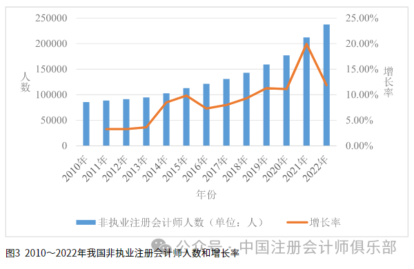 2010~2022年,我国非执业注册会计师人数呈逐年上升趋势,增长率在3.27%~19.95%之间。其中,2021年的增长率最高,为19.95%。截至2022年12月31日,全国非执业注册会计师共计237494人,比2021年净增加25216人;与2010年相比,2022年我国非执业注册会计师人数净增加151695人,增长率为176.80%。我国非执业注册会计师人数和增长率具体如图3所示。