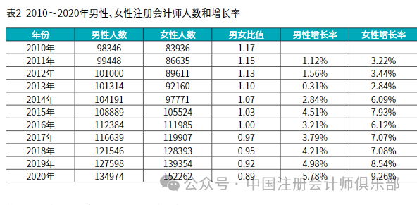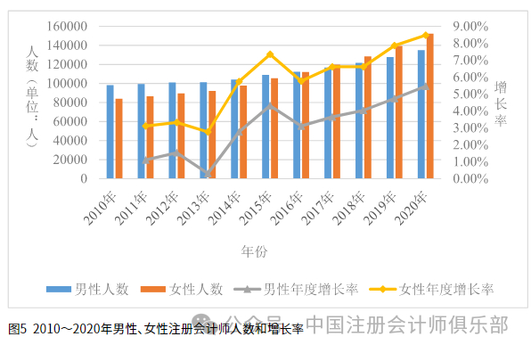 2.性别。2010~2020年,全国注册会计师性别变化情况具体如表2和图5所示。男性注册会计师人数和女性注册会计师人数均呈上升趋势,且女性注册会计师年增长率高于男性,男女比值逐年下降,从2010年的1.17下降至2020年的0.89。2017年,女性注册会计师人数(119,907人)首次超过男性(116,639人)。男性和女性注册会计师人数增长率最高均出现在2020年,分别为5.78%和9.26%;最低增长率均出现在2013年,分别为0.31%和2.84%。11年间,男女注册会计师人数差距不断扩大,且有越来越严重的趋势,照此趋势预测,未来很可能会出现男女比例失衡的问题。