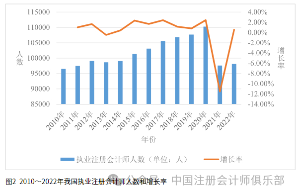 1.执业与非执业注册会计师。2010~2022年,我国执业注册会计师人数除2013年较上年略有下降、2021年出现较大幅度下降外,其他年份均呈上升趋势,增长率在-11.52%~2.42%之间。其中,2020年增长率最高,为2.42%;2021年增长率最低,为-11.52%,主要原因是2021年多地注协发布了《注册会计师挂名执业行为整治工作的通知》,对注册会计师将资格挂靠在会计师事务所但并不实际执业以及注册会计师不在会计师事务所专职执业等行为进行了整治,一万余名注册会计师被撤销或注销证书。截至2022年12月31日,全国执业注册会计师共计98,099人,比2021年净增加536人,增长率为0.55%;与2010年相比,2022年我国执业注册会计师人数净增加1,616人,增长率为1.67%。我国执业注册会计师人数和增长率具体如图2所示。