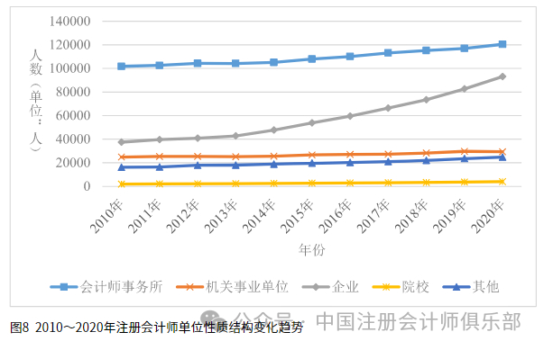 从工作单位性质来看,2010~2020年,会计师事务所、机关事业单位、企业、院校、其他单位中的注册会计师人数呈逐年上升趋势,均在2020年达到最大值,分别为120,416人、29,397人、93,103人、4,045人、24,820人。从单位性质占比来看,以2020年为例,会计师事务所、机关事业单位、企业、院校、其他单位中的注册会计师人数占比分别为44.31%、10.82%、34.26%、1.49%和9.13%。可见,当前会计师事务所和企业是注册会计师就职的两大主要去向,具体情况如图8所示。