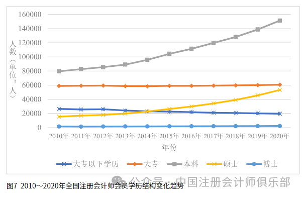4.学历。总体来看,2010~2020年,本科学历的注册会计师人数最多,博士学历的注册会计师人数最少;增长率最高的是硕士学历注册会计师,增长率达243.9%,增长率最低的是大专及以下注册会计师,为负增长,增长率为-25.5%。可见,当前我国注册会计师行业的学历结构不断优化,行业的高端智力服务属性与占相当大比例的本科及以上学历结构逐渐匹配,但是若要实现行业高质量发展,研究生以及博士等高学历人才储备还有待进一步增加。