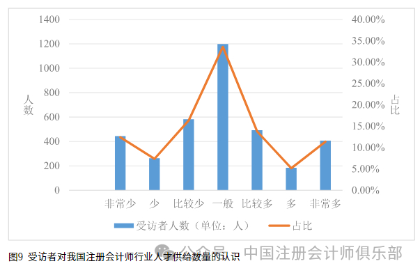 问卷调查结果显示,33.59%的受访者认为我国注册会计师行业人才的供给数量处于一般的水平,36.09%的受访者认为我国注册会计师行业人才的供给数量处于偏少状态(包括比较少、少和非常少),30.33%的受访者认为我国注册会计师行业人才的供给数量处于偏多状态(包括比较多,多和非常多)。总体来看,不同受访者对于我国注册会计师行业人才供给的看法各不相同,选择偏少、一般和偏多的呈三分天下之势。