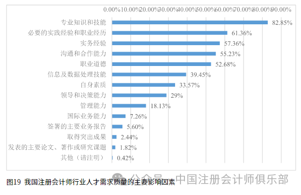 2.行业人才需求质量的主要影响因素。问卷调查结果显示,绝大多数受访者(82.85%)认为专业知识和技能对注册会计师人才质量的影响较大,61.36%的受访者认为注册会计师的实践经验和职业能力会影响会计师行业人才需求质量,超半数受访者认为实务经验(57.36%)、沟通和合作能力(55.23%)以及职业道德(52.68%)会影响会计师行业人才需求质量,具体结果如图19所示。