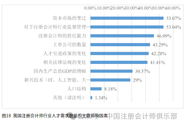 1.行业人才需求数量的主要影响因素。问卷调查结果显示,一半以上的受访者认为资本市场的变迁(53.07%)以及注册会计师行业监督管理的政策变化(53.04%)能显著影响注册会计师的需求人数,46.09%的受访者认为注册会计师的胜任能力会影响注册会计师行业人才需求数量,43.29%的受访者认为上市公司的数量会影响注册会计师行业人才需求数量、数量相当的受访者认为人才引进政策的变化(42.28%)以及相关法律法规的变化(41.41%)会影响注册会计师行业人才需求数量,具体结果如图18所示。