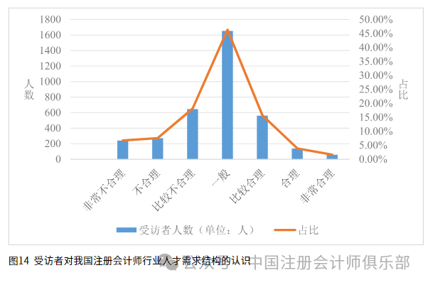 总体来看,不同受访者对于我国注册会计师行业人才需求结构的看法各不相同,多数受访者认为我国注册会计师行业人才的需求结构处于一般水平,其次为不合理状态,占比三分之一左右。