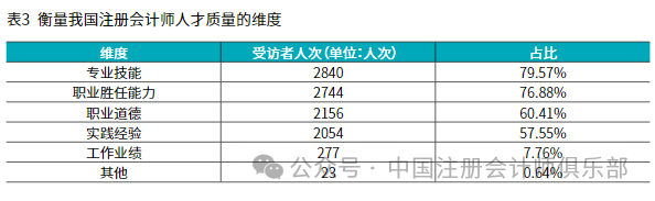 根据问卷统计结果,在3,569位受访者中,绝大部分受访者认为衡量注册会计师人才质量的维度应包括专业技能(79.57%,2,840名)、职业胜任能力(76.88%,2,744名);大部分受访者认为注册会计师的职业道德(60.41%,2,156名)、实践经验(57.55%,2,054名)能够衡量我国注册会计师人才质量;少部分受访者(7.76%,277名)认为工作业绩能够衡量我国注册会计师人才质量;极少部分受访者认为衡量注册会计师人才质量的维度为其他方面,诸如领导力、独立性、学历等,具体结果如表3和图13所示。