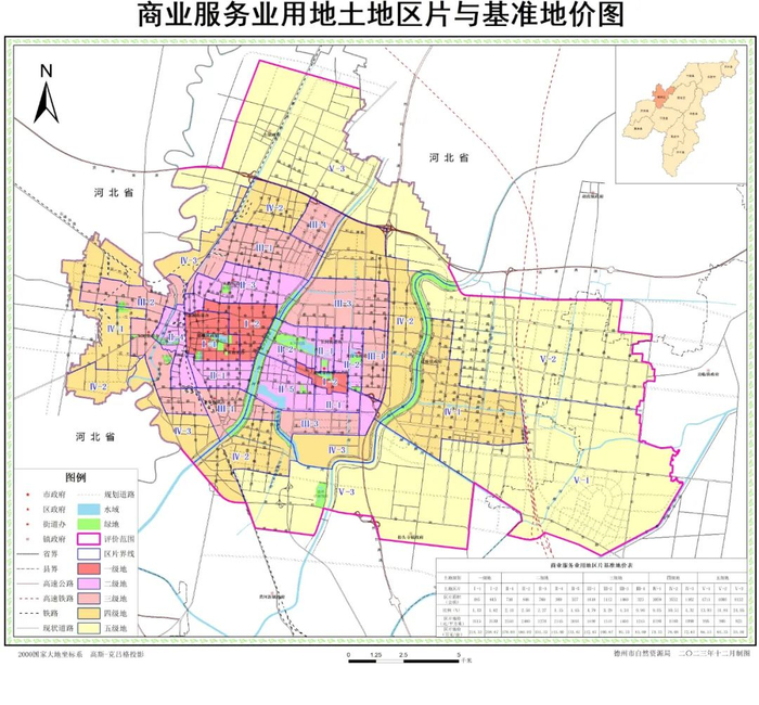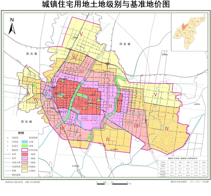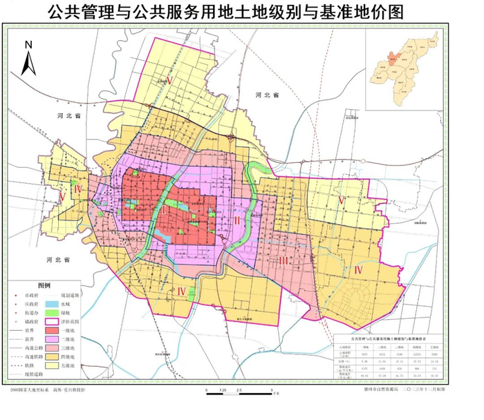 本次土地级别确定的范围为:北至天衢工业园北边缘、山东省界、北外环;东至德州天衢新区界、马颊河;南至东风东路、崇德七大道、抬头寺路、南外环、桃园路;西至运河大道、山东省界。总面积338平方公里。商业服务业用地、城镇住宅用地和公共管理与服务用地划分为五个级别,工业用地划分为三个级别。各类土地用途、各级别土地界线具体为: