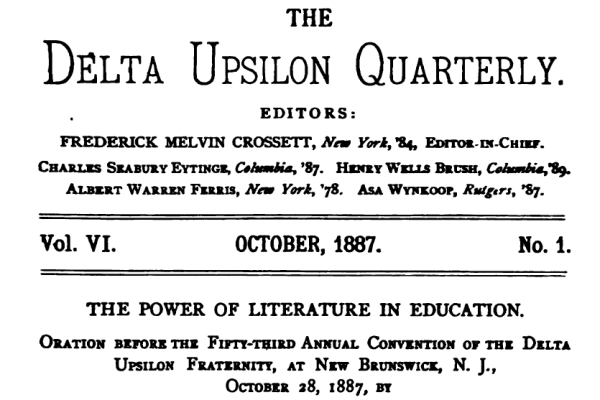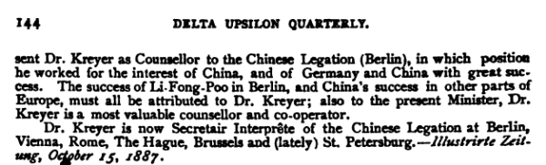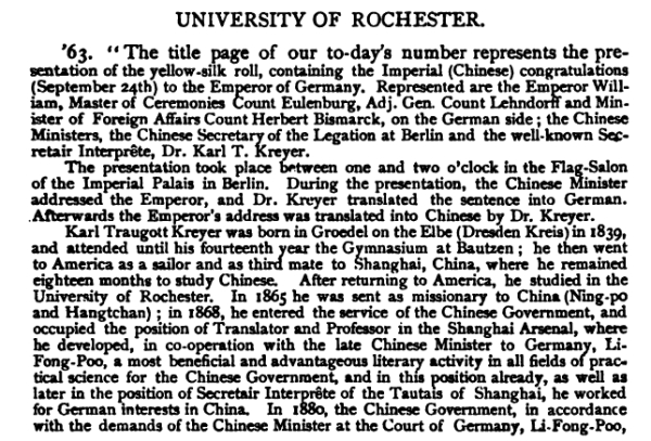 美国纽约出版的Delta Upsilon Quarterly,似乎是一份由多所大学联合发行的季刊,报道学校和师生动态。1987年10月22日号,罗切斯特大学栏目中,刊载了一篇文章,似是转译自1887年10月号德国《画报》(Illustrirte Zeitung)杂志的报道。