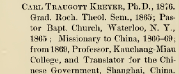 《1850-1879年罗切斯特大学师生名录》(General catalogue of the officers and alumni and of the honorary graduates of the University of Rochester, 1850-1879,1979年出版,第30页,1863年毕业栏目中,有金楷理(Carl Traugott Kreyer),注明其时任上海政府译员。来源:作者提供