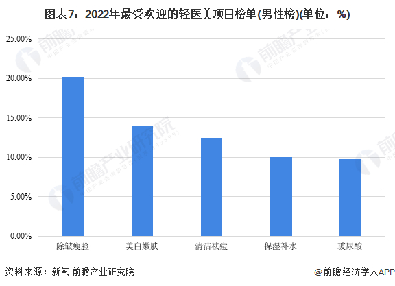 根据新氧数据,2022年,根据消费频率占比来看,无论对于女性消费者还是男性消费者,最受欢迎的两大轻医美项目均为除皱瘦脸和美白嫩肤。这两类项目对应的产品包括热玛吉、超声刀、瘦脸针、光子嫩肤、美白针等,均包括注射类项目与光电类项目。