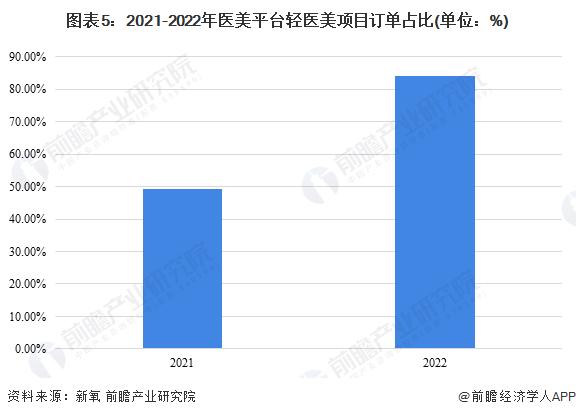 根据新氧数据,从线上订单量来看,2022年,我国医美行业中,轻医美以84%占比占据了医美市场绝大部分份额,手术类项目仅占16%。而在2021年,轻医美仅占据49.2%的市场。该数据表明,轻医美行业正处于爆发期,相比于手术类项目,伤害更小、即时效果更加明显、恢复期更短的非手术类轻医美项目正在获得更多消费者的青睐。