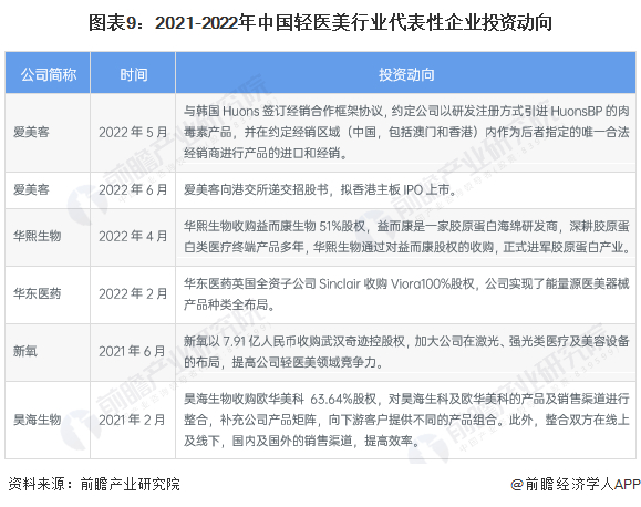 2021年以来,轻医美行业代表性企业的投资动向主要通过收购公司股权拓展业务布局,从而提高企业竞争力或拓宽产业链。轻医美代表性企业最新投资动向如下: