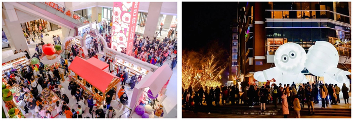 如北京朝阳大悦城在跨年期间,落地的「卡皮巴拉华北首展」吸引了众多潮流达人和时尚青年拍照打卡,开展以来现场人气爆满、排队长龙现象不断;北京中粮·祥云小镇冰雪季「ANOOKI 追光去」灯光美陈华北首展,设有ANOOKI见面会、汉服同袍花灯会和雪人巡游等多个活动主题,进一步营造出跨年节日的欢聚气氛。