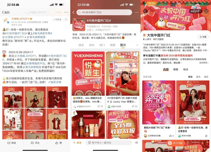 如联动「优酷」等视频平台,邀约明星艺人为大悦中国开门红录制打CALL视频进行全渠道宣发,持续扩大活动声量和传播;微博发布话题#大悦中国开门红全方位造势,活动期间,微博话题阅读量高达962.9万,话题实时热度排名第一位;联合「支付宝」发行百亿补贴、携手京东礼品站」加大会员回馈等。