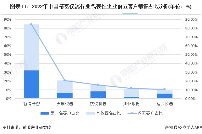 但通过分析代表性企业销售的客户可以了解到市场需求以及后续销售的可持续性。从智信精密、天瑞仪器、皖仪科技、川仪股份以及理邦仪器的前五名客户销售占比了解到,规模较小的智信精密对前五名客户依赖度极高,占营收84.27%,第一名占比32%,存在严重依赖于少数客户的情形。