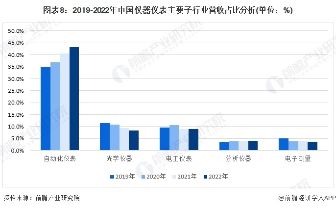 根据上海仪器仪表行业协会披露数据显示,2019-2021年,自动化仪表占全行业营收比重最高,且占比逐年增长,从34.7%上升至43.2%,其次占比较高的是光学仪器,但占比逐年下降,从11.5%下降至8.4%,其次是电工仪表,从9.6%下降为9%,此外热门子行业还有分析仪器和电子测量,分析仪器占比略微上升,电子测量占比有所下降。其他行业占比有所下降,从35.7%下降至31.8%,说明子行业集中度不断提高。从子行业的发展情况可以看出,自动化依然是仪器仪表行业的发展趋势。初步核算,2022年自动化仪表保持持续增长态势。