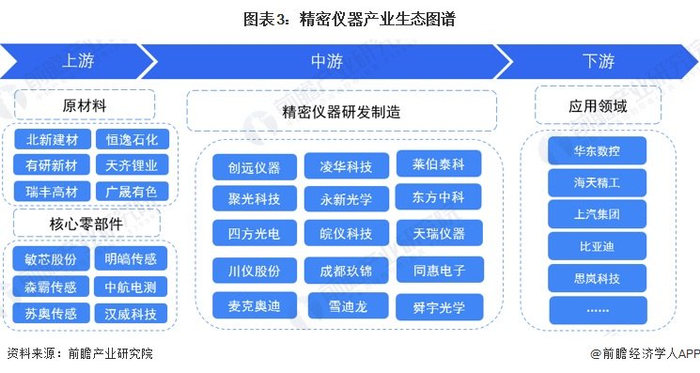 精密仪器产业链上游原材料供应企业主要有恒逸石化、有研新材和广晟有色等企业;核心零部件有敏芯股份、森霸传感、中航电测等企业。
