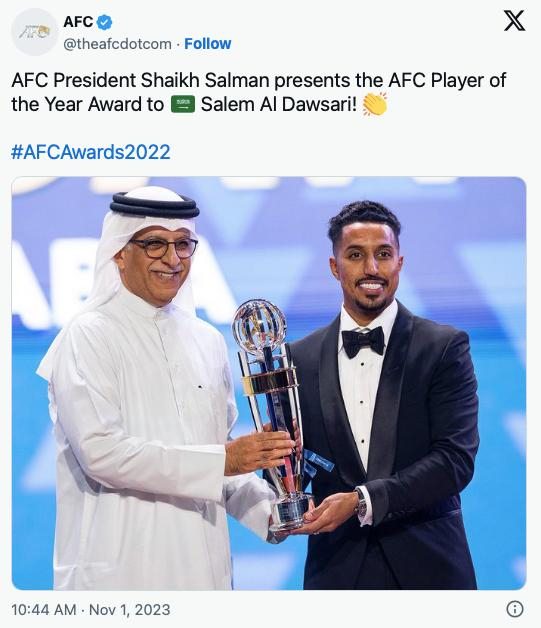 2023年11月,沙特球员阿尔多萨里当选2022年度亚洲足球先生。 图/社交媒体