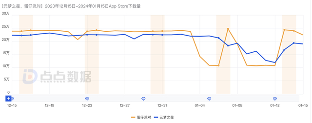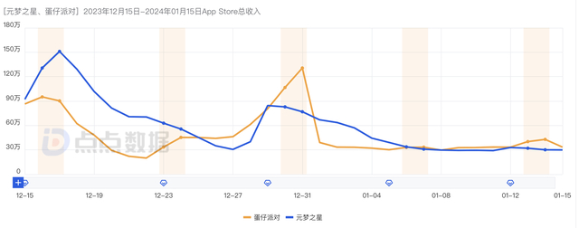 从点点数据的统计来看,12月25日圣诞节前《元梦之星》流水一直高于《蛋仔派对》,25日至2024年1月1日期间,《蛋仔派对》开始发力,整体收入凌驾于《元梦之星》之上,元旦节之后《元梦之星》再次领先,1月6日至今,两款游戏的流水已经接近。