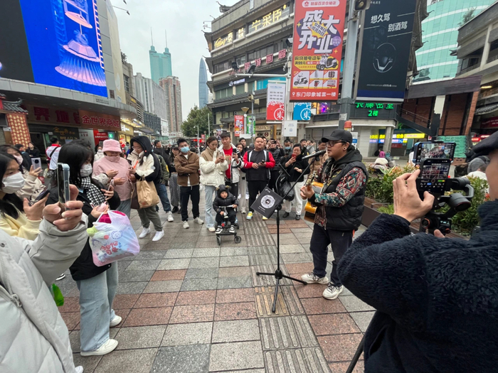 与此同时,东门步行街上也出现了网络才艺主播的身影。与谢定强这种偶尔来“扫街”的直播方式不一样,这些主播是以东门街景为背景来表演才艺,进行较为固定且长时间的直播。2023年3月,谢定强也曾去凑过热闹,那时围观直播的市民还不多。他一路跟着从侧面直播一位女主播,发现自己也吸引了一波流量。