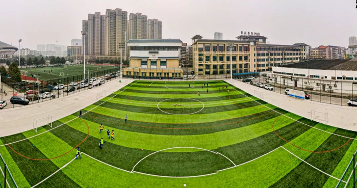 该足球场紧邻沙市区豉湖路武商量贩,原本是一处废旧停车场,如今被改造成了2片11人制和7人制足球场。它与奥体中心内的田径、乒乓球、健身步道等运动场地相互补充,组成了一个城市运动综合体。每天傍晚时分或是每逢周末,不少市民来此锻炼健身,以球会友。