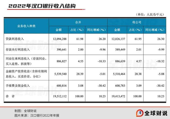 2022年汉口银行营业收入同比增长23.05%,归母净利润大增56.48%。此时的汉口银行业绩增长靠的还是规模拉动。2022年该行贷款利息收入同比增长26.2%,但存放央行利息收入等均下降,其中手续费及佣金收入同比下降30.42%。同年,该行贷款总额同比大增13.71%,但其净息差水平低于同业平均水平,2022年汉口银行净息差1.47%,同期银行业水平为1.91%。尽管该行近年来的净息差水平是在上升,而行业整体是下行,但实在是该行净息差水平太低的缘故,2020、2021年银行业净息差水平分别为2.1%和2.08%,同期汉口银行分别为1.02%和1.11%。