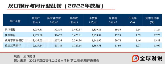 不过资产质量下行压力还继续存在。2023年9月末,不良“双升”,不良贷款余额85.52亿元,较上年末增加10.66亿元,不良贷款率2.77%,较上年末增加0.13个百分点,以上市行水平来看,汉口银行不良水平偏高。在可比同行业中不良率水平也偏高。从下图可以看到,汉口银行在这几个可比银行中资产体量最大,但净利润却不是最高,而不良贷款率却是最高。