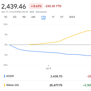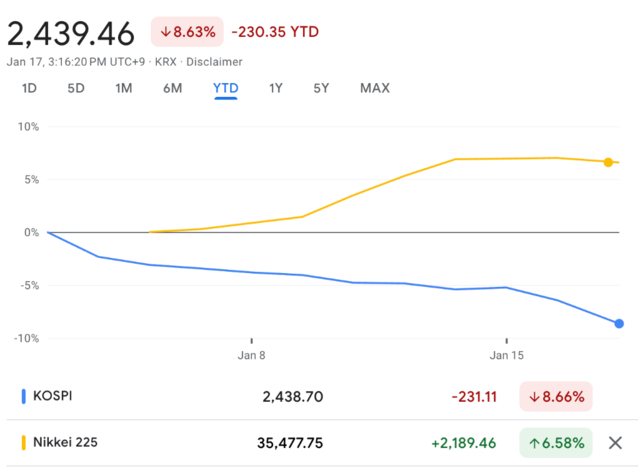 韩国KOSPI指数在最高达到2675.8点后,连跌8天,在第9个交易日小幅反弹之后,最近两个交易日再次下挫,截至1月17日年内累计跌幅超过8.6%,报2435.90点。
