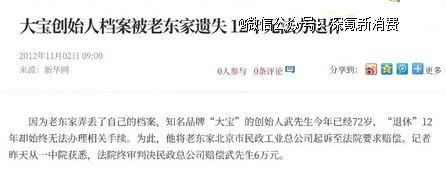 大宝的创始人武宝信,在被公派归国后不仅请求安排工作被拒,还发现档案“被丢失”,以至无法办理退休手续,多年寻找未果后,为诉讼奔波了22年,胜诉后获赔6万元。