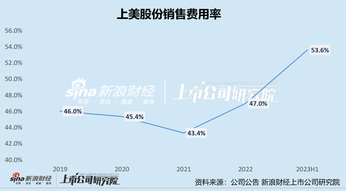 韩束品牌销售额增长的同时,上美股份销售及分销开支大幅增长,2023年上半年公司销售及分销开支为8.51亿元,同比增长39.93%,销售及分销开支占全部收入的比例也由2022年上半年的48.15%增长至53.6%。