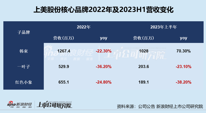 2022年,韩束、一叶子及红色小象销售额跌幅均超出20%,2023年上半年一叶子和红色小象的销售额表现延续业绩颓势。其中,一叶子的营收为2.04亿元,同比下降23.1%,营收占比为12.8%;红色小象的营收为1.89亿元,同比下降38.2%,营收占比为11.9%。