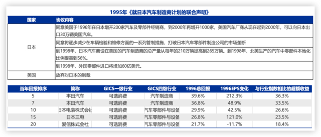 分析师观察到,1995年中,长达十余年的日美汽车贸易战进入尾声,次年日本汽车股随即反弹: