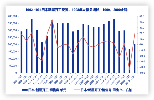 1991年日本地产泡沫破裂后,1992-1998日本房价开启连续7年下跌,至1999年底日本实际房产价格看似“止跌”,与此同时,同时新屋开工数和居民部门杠杆率同步回暖,地产有企稳预期,2000年地产链公司上涨。