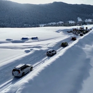 2024年1月16日,新疆阿勒泰,滞留的游客车辆,在交警引导下依次有序离开禾木村。视觉中国 视频截图