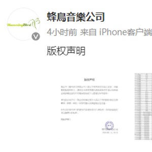 1月16日晚,邓紫棋前经纪公司蜂鸟音乐通过官方微博发布版权声明,未经其公司许可,禁止任何单位或个人将所列音乐作品用作翻唱、复制、演出、网络传播以及其他商业性用途。其中涉及邓紫棋的多张专辑和多首热门歌曲,引发热议。
