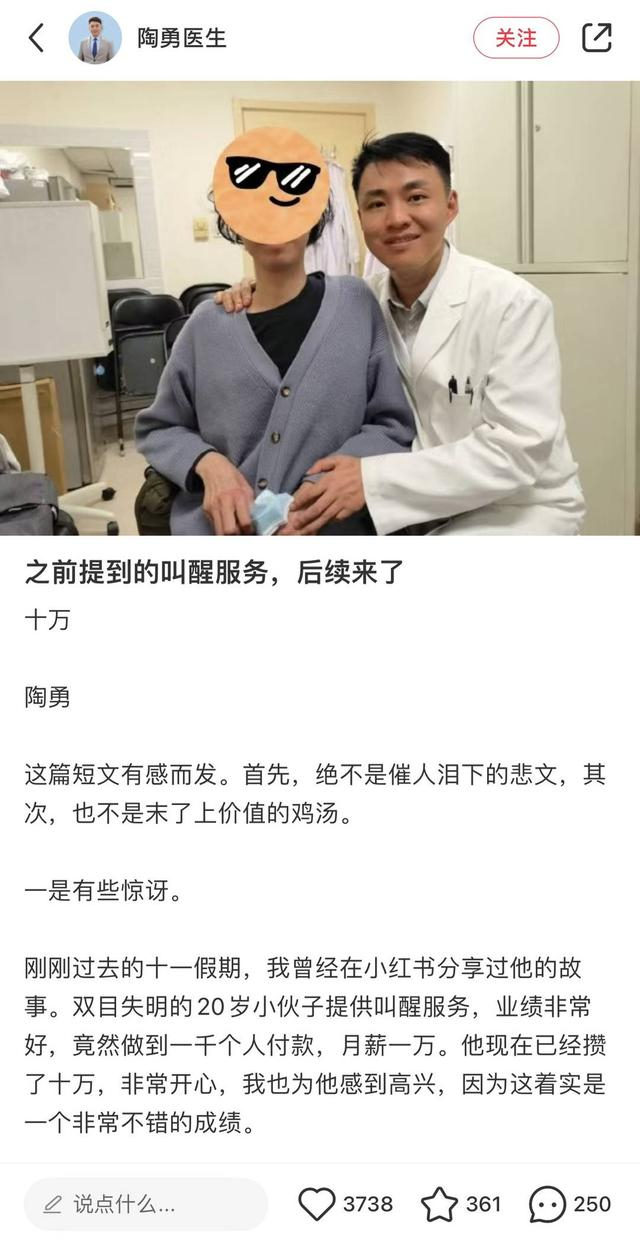 此前,北京朝阳医院眼科医生陶勇曾在公开场合分享,他有一位患者现在从事“叫醒服务”,一个月能挣一万块钱。陶勇表示:“对于视障人士来说,本来眼睛看不见是缺点,结果在叫醒服务这个领域,反变成了他的优点。因为他困了随时可以睡觉,凌晨三点起床也不觉得痛苦。”