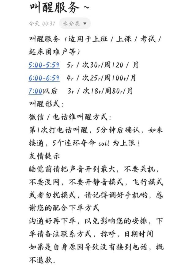 叫人起床,也能挣钱?在社交平台上,不少网友晒出“叫醒服务”项目。点开链接后,展示着详细的服务内容及其收费标准。
