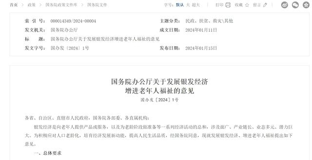 1月15日,国务院办公厅印发《关于发展银发经济增进老年人福祉的意见》,这是我国首个以“银发经济”命名的政策文件,聚焦4个方面,推出26项举措。