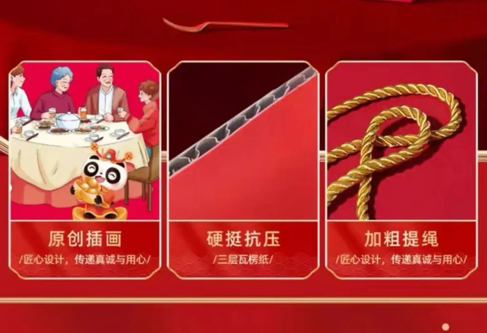 每款礼盒都是硬挺的三层瓦楞纸包装,传统的中国红设计让人看着满是欢喜。