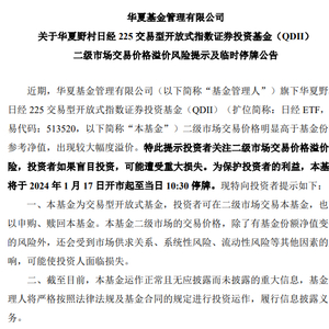 1月17日,华夏基金发布公告称,华夏野村日经225交易型开放式指数证券投资基金(QDII)(简称“华夏日经225ETF”)二级市场交易价格明显高于基金份额参考净值,出现较大幅度溢价。
