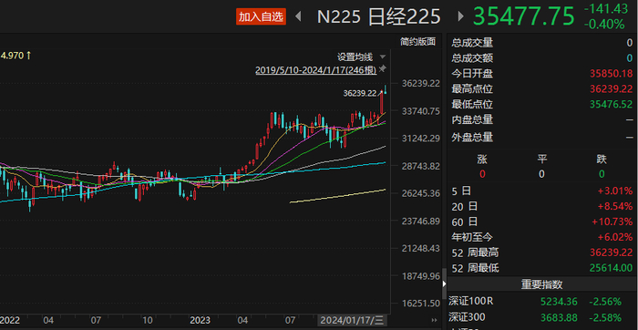 截至1月17日,近一年日经225指数涨幅超过35%。2024年以来,该指数涨幅达6.02%。
