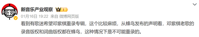 而此次蜂鸟音乐发布版权声明,被视为是此前双方争议的“连续剧”。截至1月17日21时,邓紫棋方面尚未对此次事件做出回应。