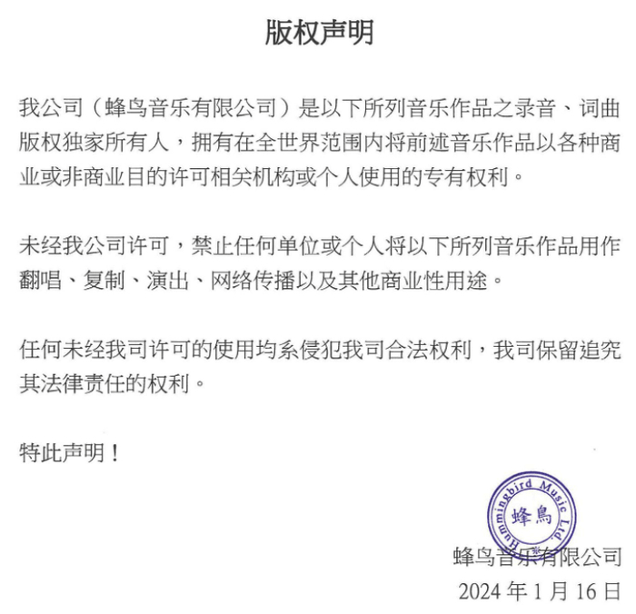 公司在声明中表示,“未经我公司许可,禁止任何单位或个人将以下所列音乐作品用作翻唱、复制、演出、网络传播以及其他商业性用途。”