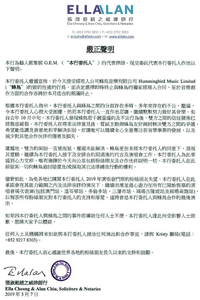 在此前的解约风波中,蜂鸟音乐声明,公司与G.E.M.邓紫棋签订了两份合约,有效期为2022年。蜂鸟全权拥有在合约生效期间所有由G.E.M.制作或与G.E.M.合作制作的任何音乐作品及录制的版权,以及某些其他商标及知识产权。随后,蜂鸟音乐与邓紫棋互诉违约,双方对簿公堂。