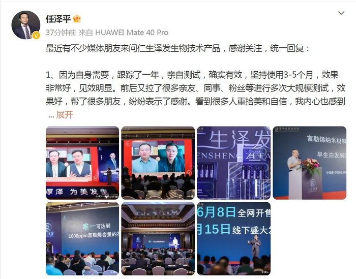 据公开的图片显示,任泽平正在介绍着这款产品,背后印着“中国科学院化学研究所技术支持,唯一可达到药用级别”等字样,不仅如此,中国科学院化学研究所王春儒研究员还在现场分享了“富勒烯纳米材料促进毛发再生及早生白发转黑的应用研究”。
