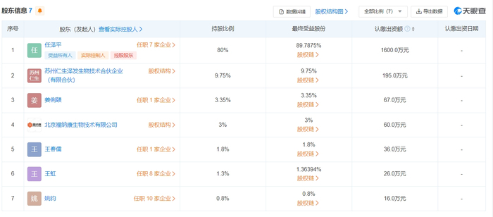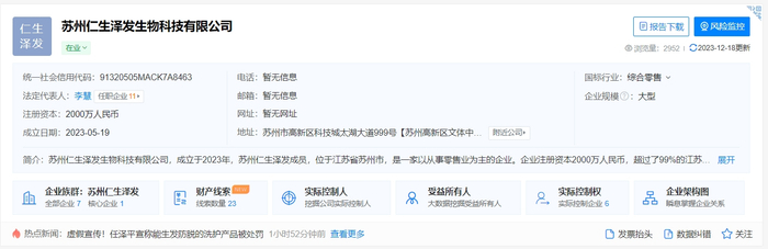 天眼查显示,苏州仁生泽发生物科技有限公司成立于2023年,企业注册资本2000万人民币,经营范围为第三类医疗器械经营;中药饮片代煎服务;药品零售;化妆品生产等。任泽平持有该公司80%股份。