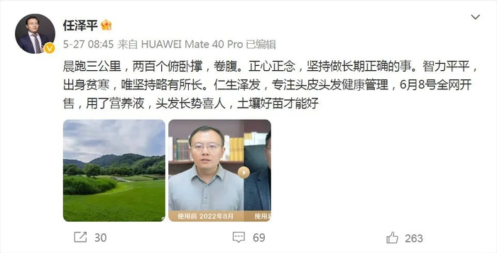 2023年5月29日,任泽平在微博发布了一则带货推文,产品是一款名为“仁生泽发”的头皮调理套盒。