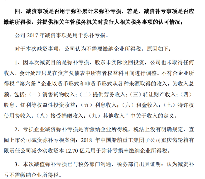 鉴于公司累计亏损,为优化公司资本结构,提高公司每股净资产水平,公司实施本次减资。公司本次减资不涉及股东实际收回投资,会计处理上在资产负债表所有者权益科目间进行调整,不涉及《中华人民共和国企业所得税法》(2007 年施行)第六条“企业以货币形式和非货币形式从各种来源取得的收入,为收入总额。包括:(一)销售货物收入;(二)提供劳务收入;(三)转让财产收入;(四)股息、红利等权益性投资收益;(五)利息收入;(六)租金收入;(七)特许权使用费收入;(八)接受捐赠收入;(九)其他收入。”所定义的收入。
